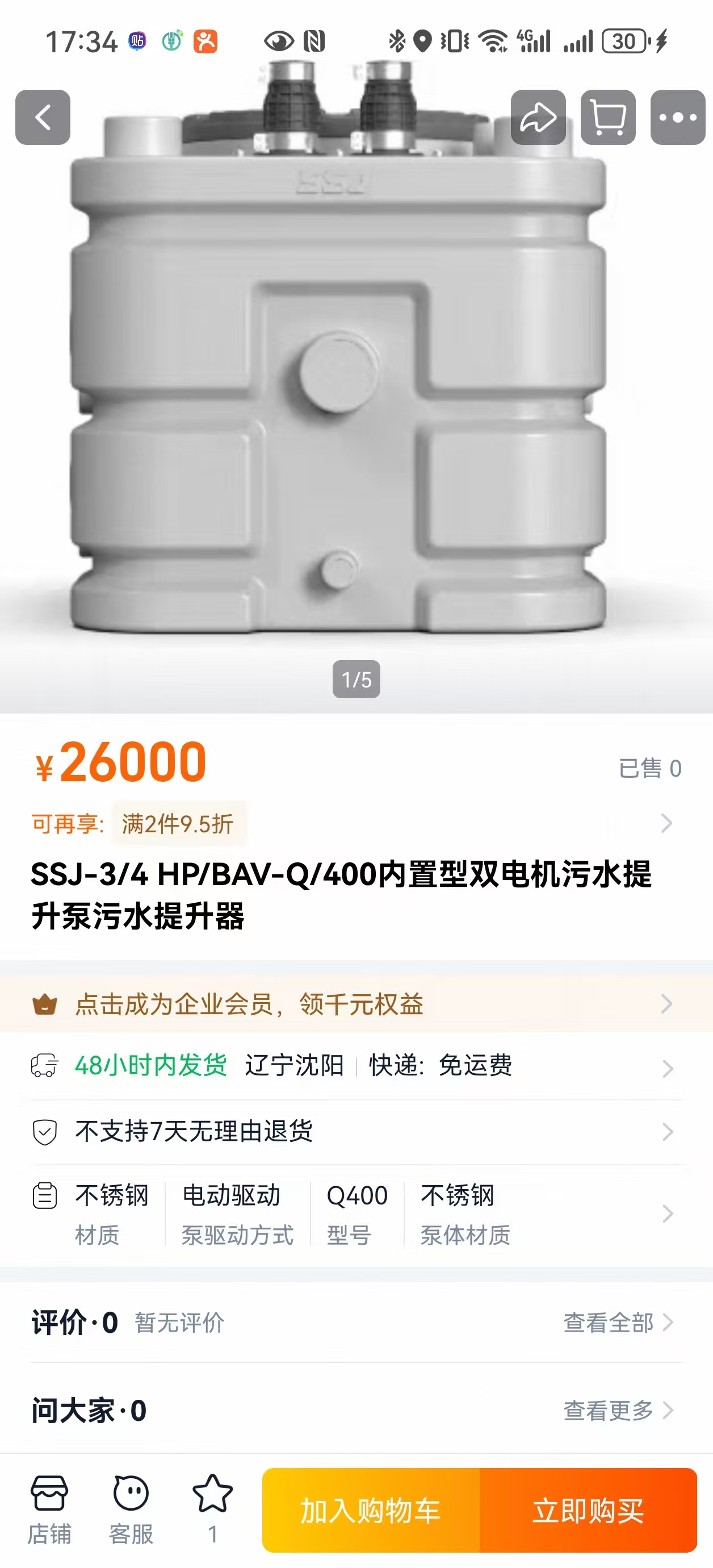 单电机型号是SSJ的核心走量款,适配绝大多数家庭、小型商铺的排水需求,价格区间集中在12000-26000元,按箱体容积与性能分为三大梯队:
